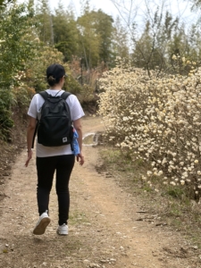 昨日はハイキングに行きました。 山を歩いていたら、丸くてかわいい黄色い花がいっぱい咲いているのに出会いました。ミツマタと…